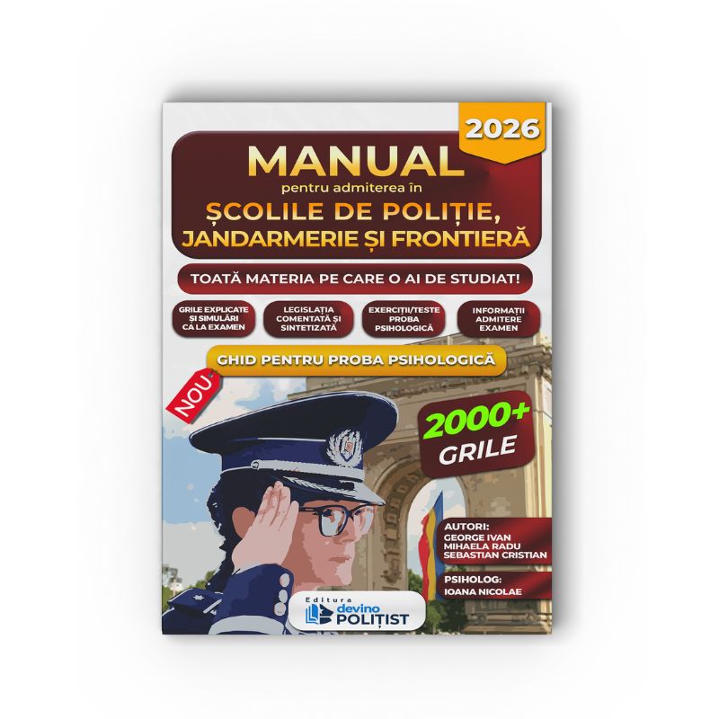 Vrei să intri la școlile de poliție, jandarmerie și frontieră? Alegerea unui manual de admitere complet, cu legislație, limba română, limba engleză, logică și raționament grile explicate, și ghidul pentru proba psihologică este esențială. Manualul nostru te ajută să înveți organizat, să exersezi cu peste 2000 de grile în formatul celor de la examen și să îți clarifici materia din tematică.